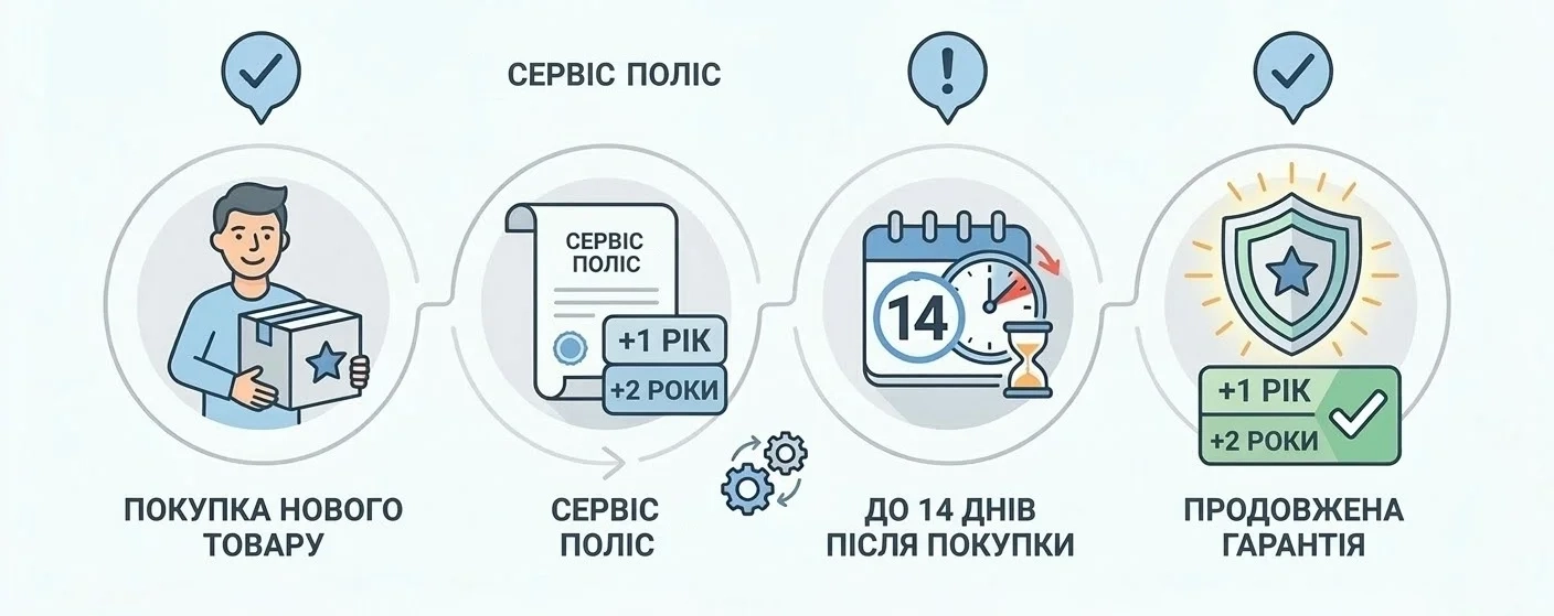 - Варіанти продовження: Ви самі обираєте термін додаткового захисту — 1 або 2 роки. Цей період починається одразу після завершення основної гарантії від виробника.
