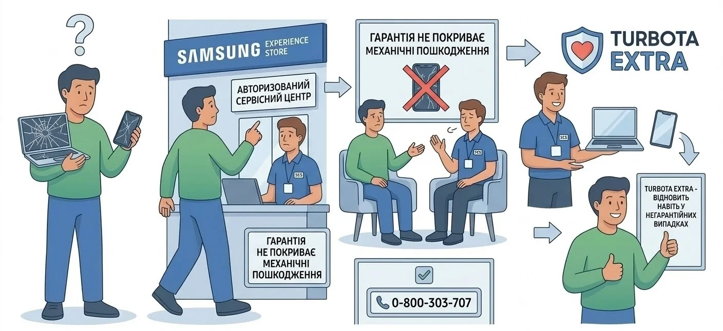 - Сервіс Turbota Extra: це ваша «страховка» від непередбачених ситуацій. На відміну від звичайної гарантії, ця послуга дозволяє відновити пристрій, якщо він постраждав у результаті: