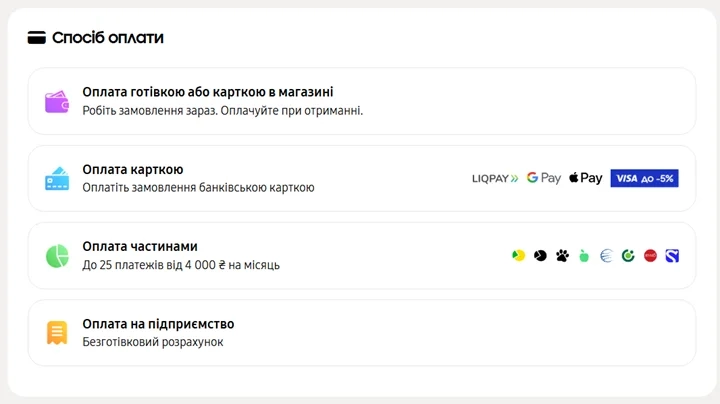 - оплата частинами від: Монобанк, ПриватБанк, А-Банк, Глобус Банк, OTP Банк, Sense Bank, ПУМБ.