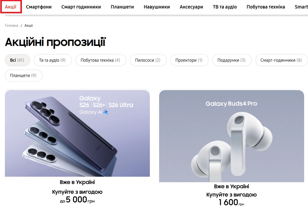 - Прямі знижки: Зниження цін на популярні моделі смартфонів серії Galaxy, планшети, носимі пристрої та побутову техніку.