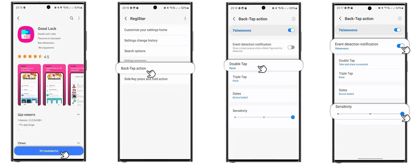 - В настройках RegiStrar активировать функцию “Back-Tap action”.