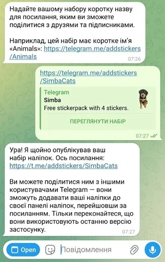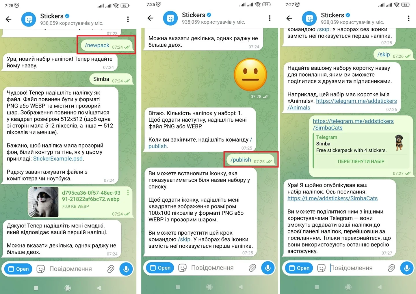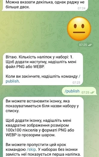 Когда изображения готовы, пора собрать их в коллекцию. Это делается через официальный сервис мессенджера.
