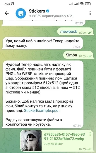 - Бот не принимает файл: Проверьте размер. Если картинка 512x513, бот выдаст ошибку.