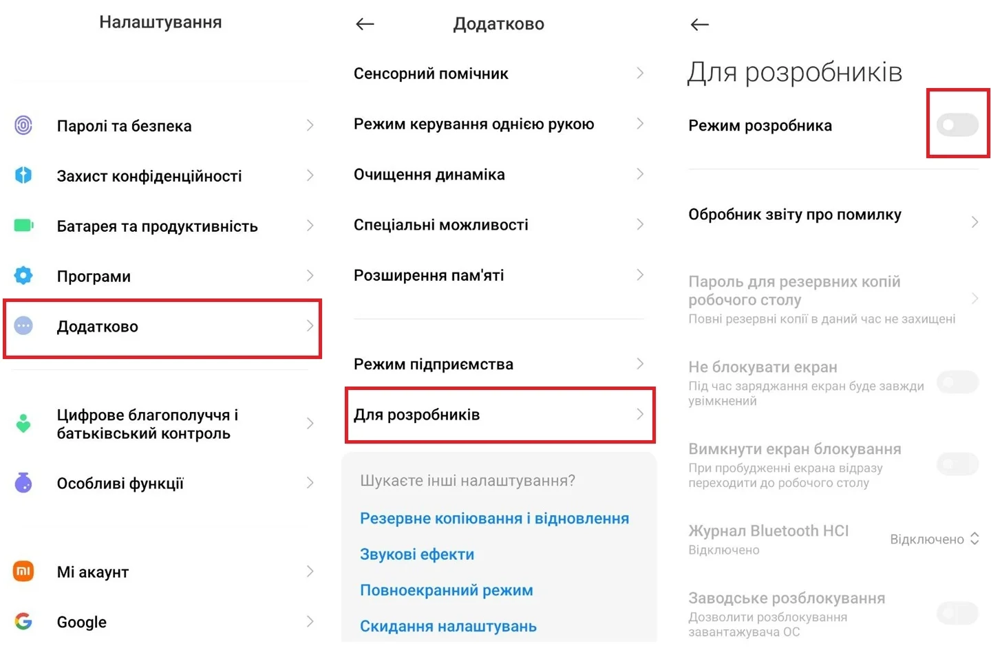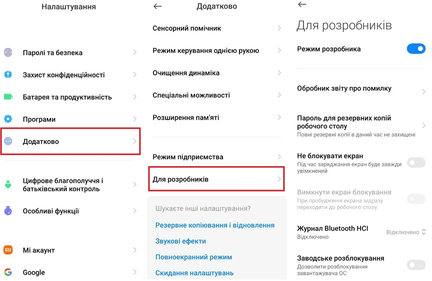- Налагодження по USB: активація передачі команд між ПК і телефоном через міст ADB.