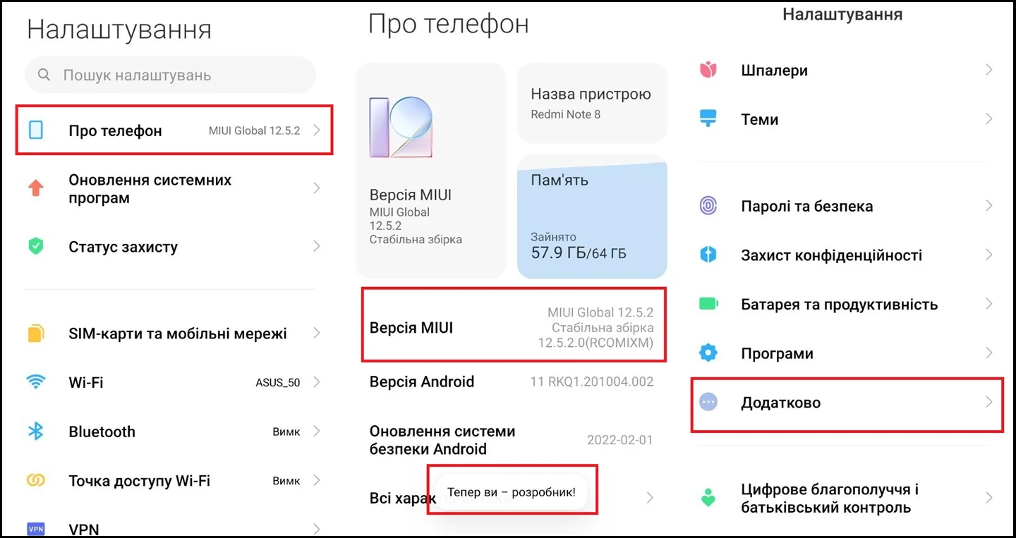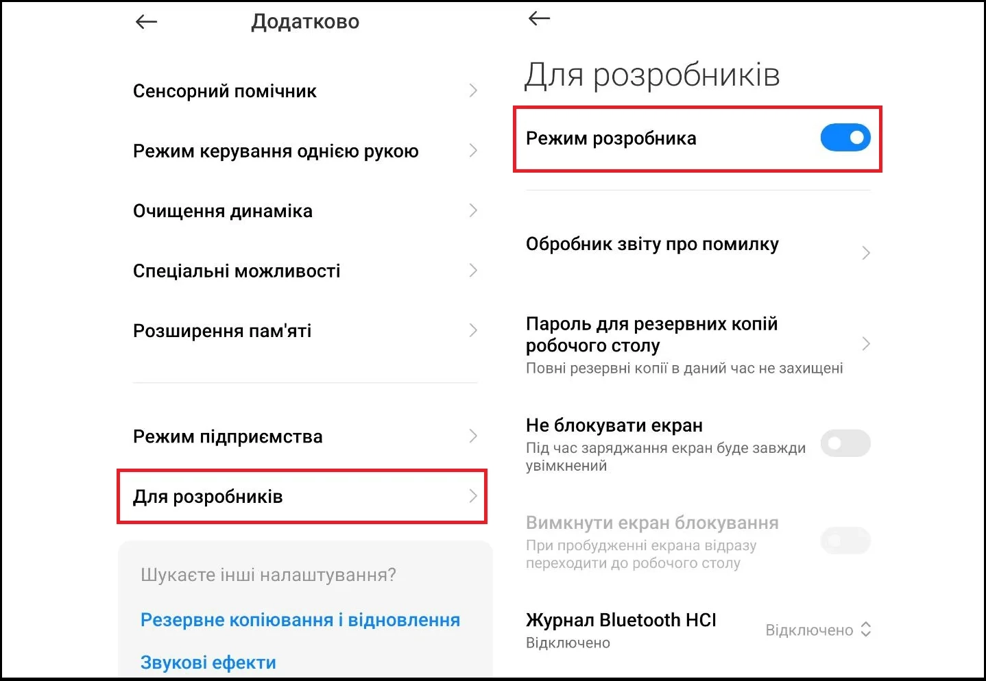 - Внизу екрана з'явиться напис: «Режим розробника увімкнено».