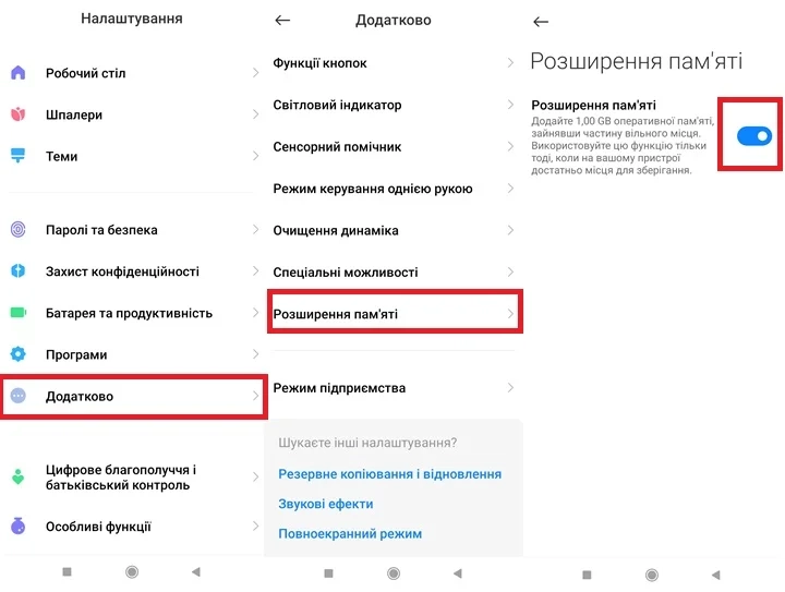 - Скористайтеся функцією віртуального розширення пам'яті. Ви зможете додати від 1 до 8 Гб. В налаштуваннях знайдіть розділ «Додатково» і виберіть пункт «Розширення пам'яті». Поставте маркер в положення Увімк.