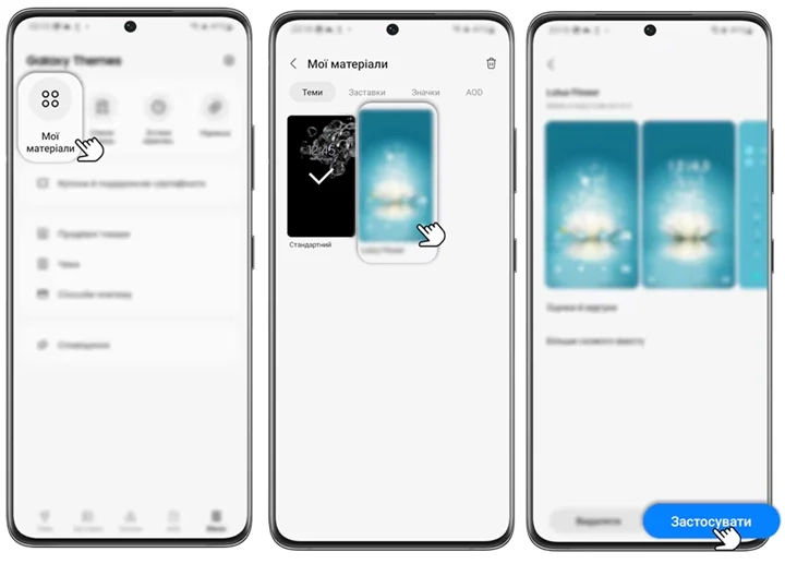 - У застосунку Galaxy Themes перейдіть до розділу «Мої матеріали» (зазвичай це іконка людини або меню в кутку).