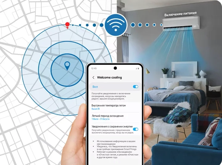 - Інтелектуальний таймер. У моделях з підтримкою SmartThings управління здійснюється через онлайн-додаток, що дозволяє не тільки гнучко задавати розклад, але і контролювати стан пристрою, спрощуючи профілактику кондиціонера.