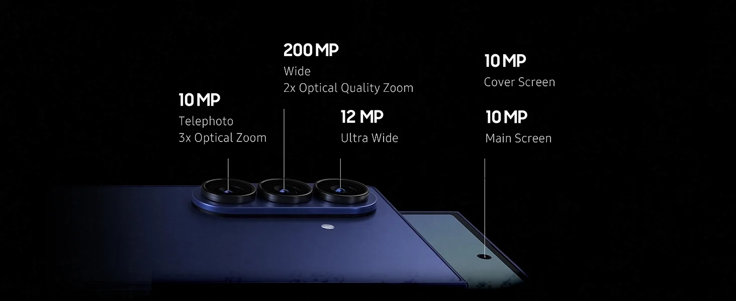 Галаксі Фолд 7 отримав потрійний модуль основної камери на 200+10+12 Мп. Смартфон підтримує функцію Flex Mode, завдяки якій працює у форматі напіввідкритого лептопа. Це зручно для стрімінгу, створення контенту, влогів і відеочату. Фронтальна камера на 10+4 Мп оснащена поліпшеними алгоритмами фокусування і балансу білого, які роблять фото чіткими вдень і вночі.